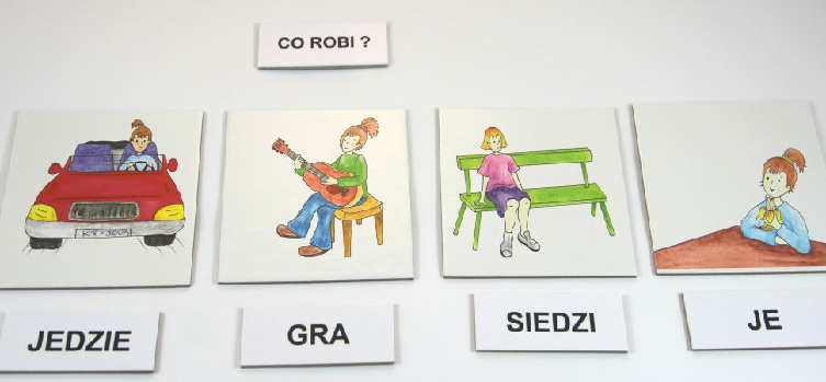 Zestaw ten służy do nauki nazw czynności w 3 osobie liczby pojedynczej, nauki czytania pełnymi wyrazami (czytanie globalne), rozumienie pytania: Co robi?